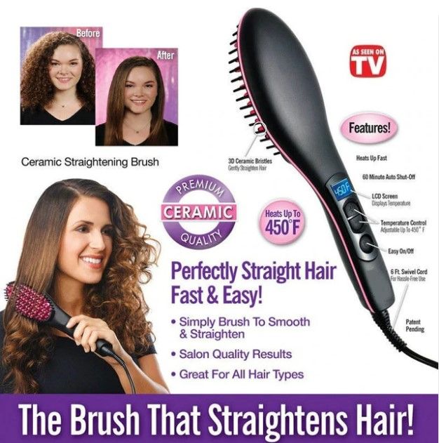 Simply straight is the ceramic brush that straightens your hair as you brush it. It combines the power of a flat iron with the gentle styling of a brush,perfect for any hair type and length. Simply Straight gives you perfectly straight,salon-quality results in just minutes,with no flat iron damage,no chemicals,and no hassle.